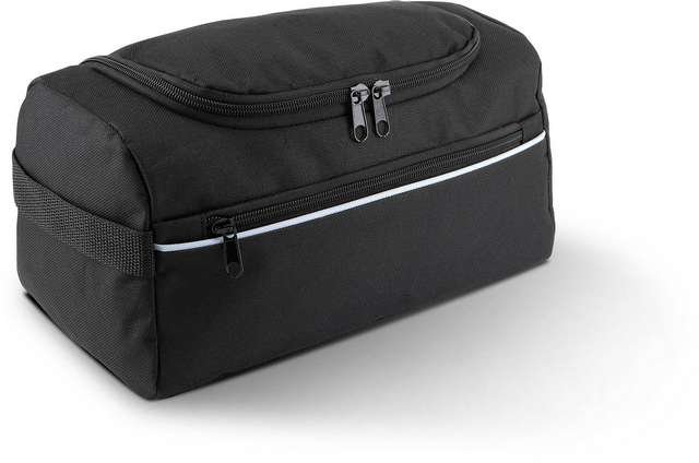 Toiletry bag in 600D polyester;Hookable top flap;Inner pocket;Large front pocket;Side handle;