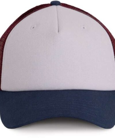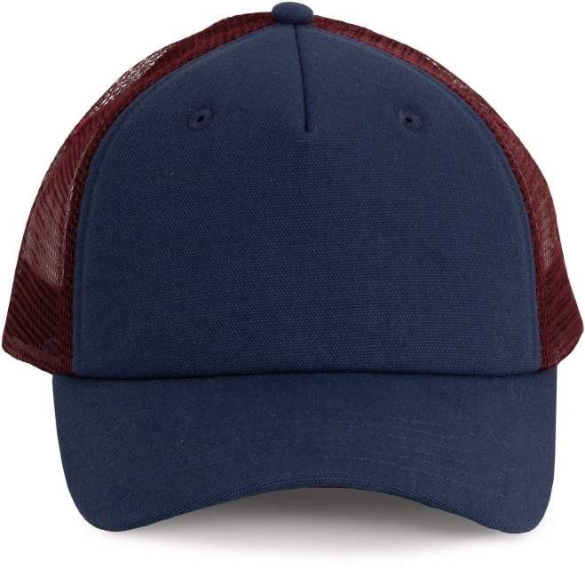 98% cotton / 2% polyester;Trucker style cap – 5panels;Front panels and peak in cotton canvas and polyester knit mesh;Adjustable plastic closure;