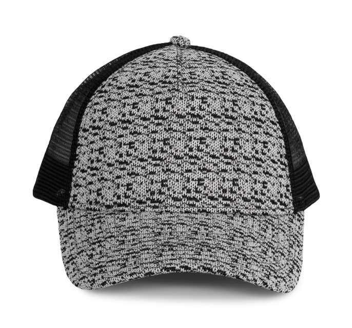 100% polyester;Trucker style cap – 5panels;Front panel in knitted polyester. sneaker mesh look;100% polyester knit mesh;Adjustable plastic closure;
