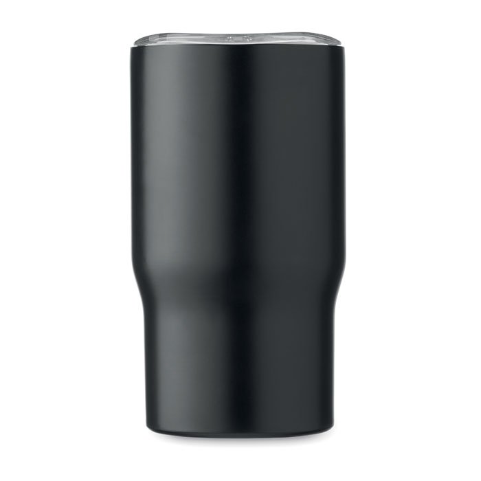 Double wall tumbler in recycled stainless steel (90% recycled stainless steel and 10% stainless steel) with wooden handle. Capacity: 350 ml.