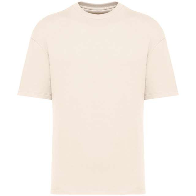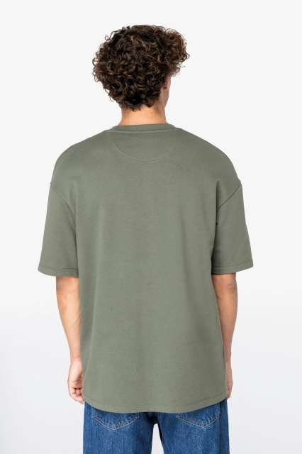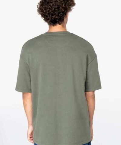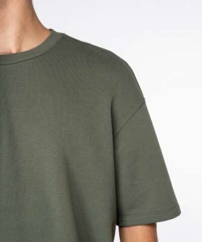 85% organic cotton/15% post-consumer recycled polyester;Combed cotton;Oversize fit;Hybrid sweatshirt–t-shirt;LST (Low Shrinkage Terry) unbrushed 3-yarn fleece;1/2 circle in the back;Enzyme-washed;1 x 1 rib neckline;Twin needle finish on the cuff and bottom hem;