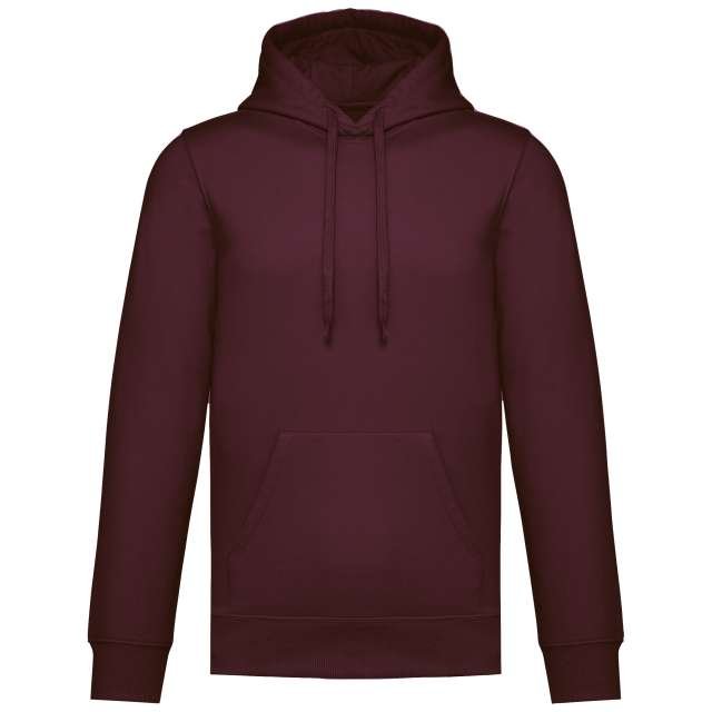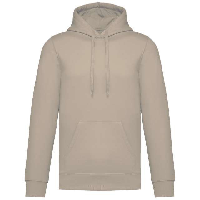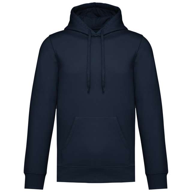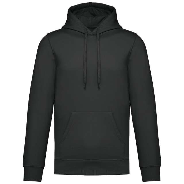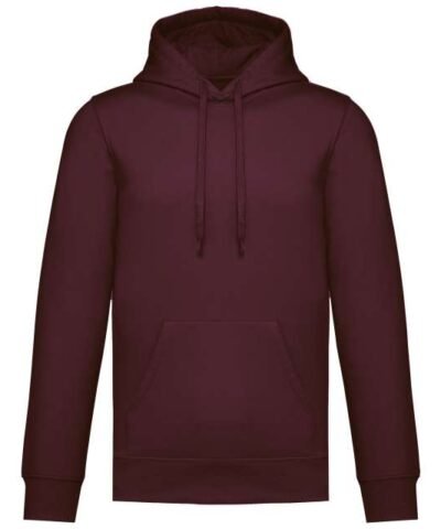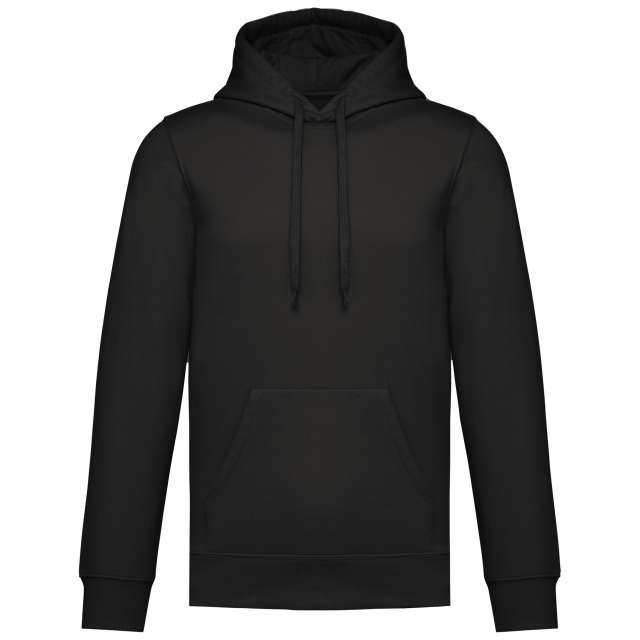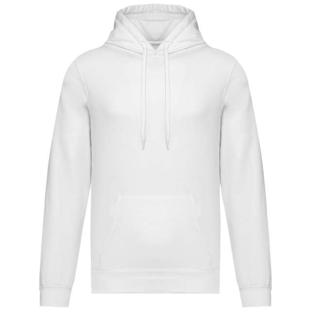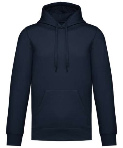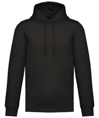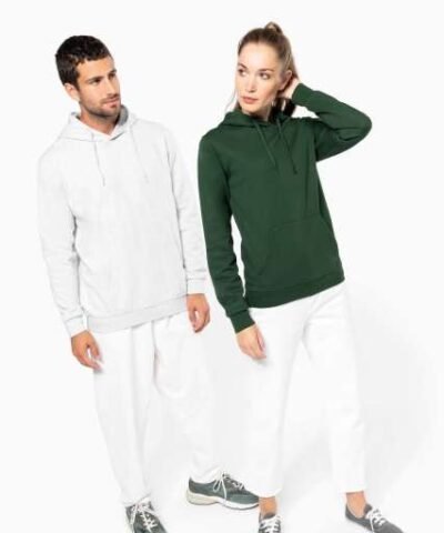 50% ring spun cotton / 50% recycled polyester;Brushed fleece;Straight fit;Cut and sewn;1×1 ribbing with a tubular assembly for a better finish on the neckline. cuffs and bottom hem;Kangaroo pocket;Polycotton jersey-lined hood with flat drawstring;Tone-on-tone jersey taped neck inside the neckline;No brand label on the neckline. only a size tag for easy decoration;