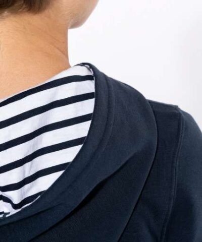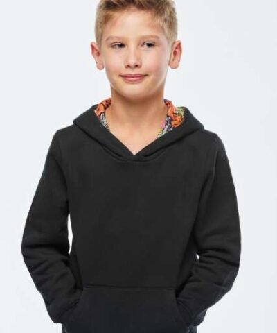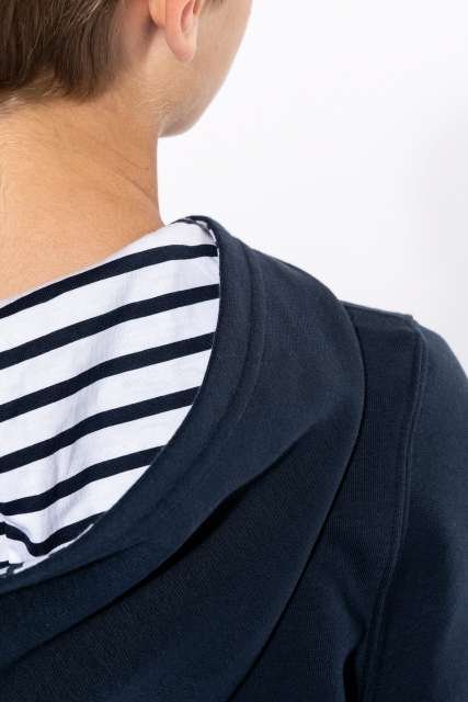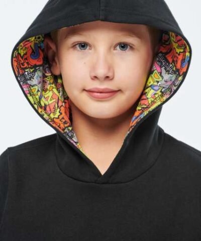 80% combed cotton/20% polyester;3-yarn brushed fleece;Slim fit;Straight sleeves;Kangaroo pockets;Half-moon finish at the neckline to facilitate decoration access inside the neckline;1×1 ribbed cuffs and hem;Hood lined with themed printed cotton jersey fabric;Tear-away brand label;