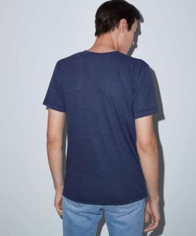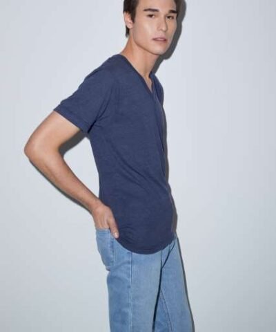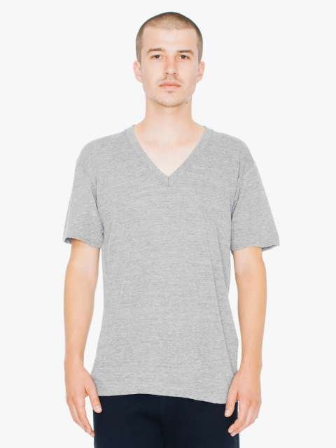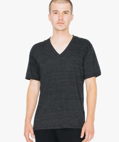 136.0 G/SqM;50% Polyester /25% Cotton /25% Viscose;Yarn Count 30/1;Shoulder-to-shoulder tape;7/8” mitered v-neck collar;1” blind-stitch sleeve hem;1” double-needle bottom hem;Side seam;Double-satin razor label;