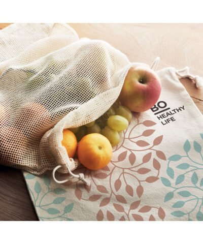 Re-usable food bag. One side is in cotton (140gr/m²) and other one is in mesh cotton (110gr/m²). Drawstring closure.