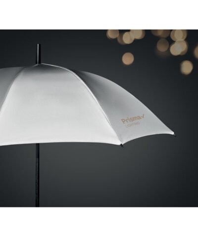 23 inch manual open windproof umbrella in high reflective polyester with fiberglass shaft and ribs. Black plastic tips and top. Black rubberised grip. Manual closure.
