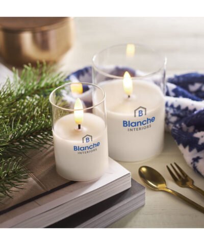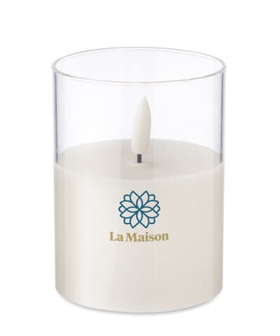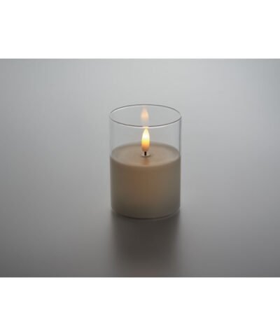 Real flame-effect LED wax candle in glass holder. 2 AA batteries not included.