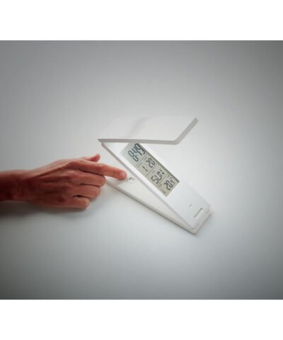 18 LED foldable desktop lamp in ABS. Displays time, temperature. Alarm function. 1 CR2032 battery included.